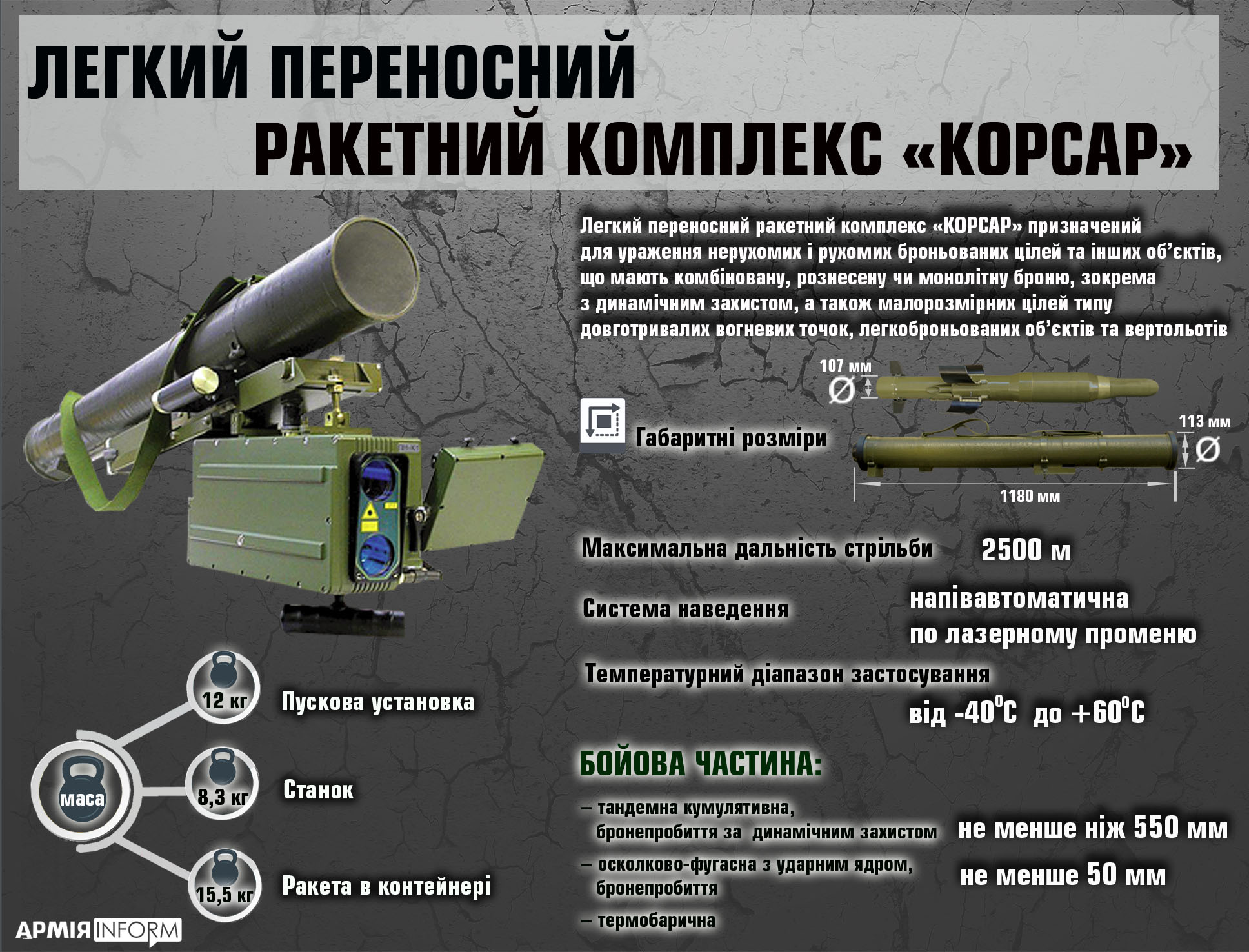 Корсар, в частности, является легким переносным ракетным комплексом. Габариты позволяют вести огонь "с плеча" и без дополнительных устройств. Наведение выполняется с помощью лазерного луча и на низкоэнергетическом уровне излучения.