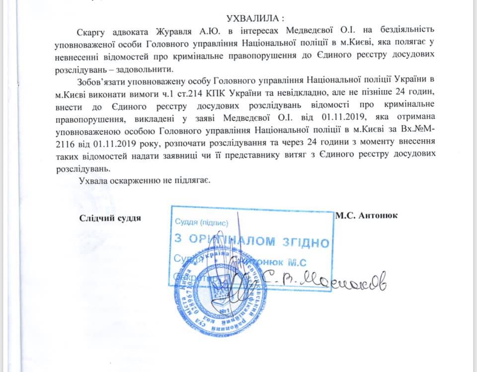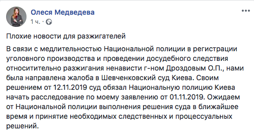 "Плохие новости для разжигателей. В связи с медлительностью Национальной полиции в регистрации уголовного производства и проведении досудебного следствия относитительно разжигания ненависти г-ном Дроздовым О.П., нами была направлена жалоба в Шевченковский суд Киева. Своим решением от 12.11.2019 суд обязал Национальную полицию Киева начать расследование по моему заявлению от 01.11.2019. Ожидаем от Национальной полиции выполнения решения суда в ближайшее время и принятие необходимых следственных и процессуальных решений", - написала Медведева.