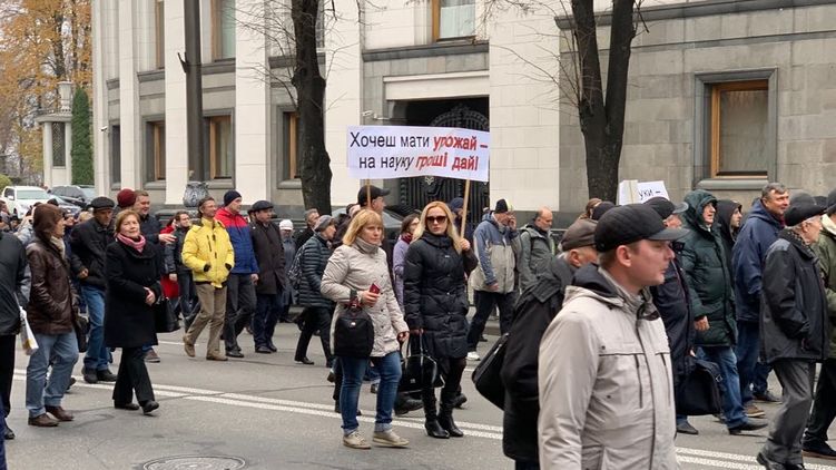 Ученые требуют увеличения расходов на финансирование науки в государственном бюджете на 2020 год. "Хочеш мати урожай, на науку гроші дай" написано на одном из плакатов протестующих.