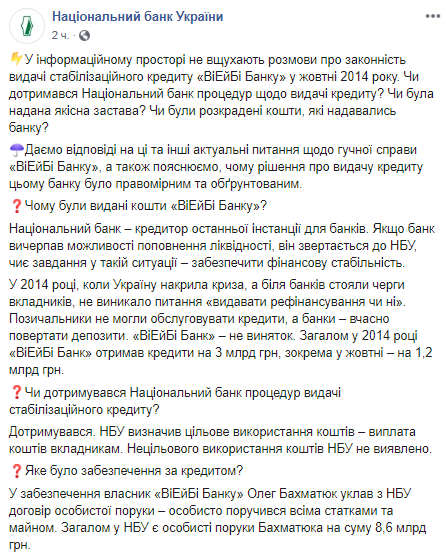 "Всего в 2014 году" VAB Банк "получил кредиты на 3 млрд грн, в том числе в октябре - 1,2 миллиарда грн. В свою очередь, Национальный банк придерживался всех процедур выдачи стабилизационного кредита", - говорится в сообщении.