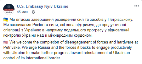"Мы приветствуем завершение разведение сил и средств в Петровском. Мы призываем Россию и силы, которые она поддерживает, к продуктивному сотрудничеству с Украиной в направлении дальнейшего прогресса в восстановлении контроля Украины над ее международным рубежом", - говорится в сообщении.
