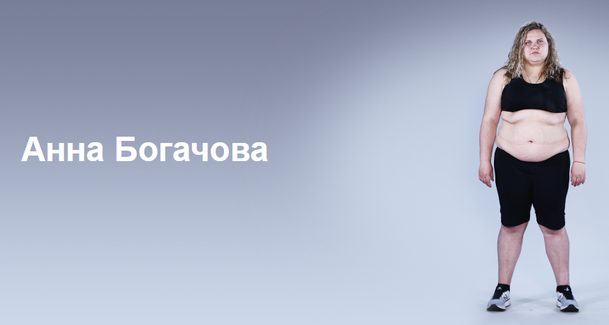 Анна Богачова. Ей 22 года, она живет в селе Диканьки. Занималась пауэрлифтингом, но оставила его из-за проблем со спины, теперь увлекается флористикой. Анна рассказала, что выигрыш помог бы ей начать свой бизнес, о чем она мечтает. На проект она пришла с весом 123 кг и за 12 недель похудела на 25 кг - до 98 кило.
