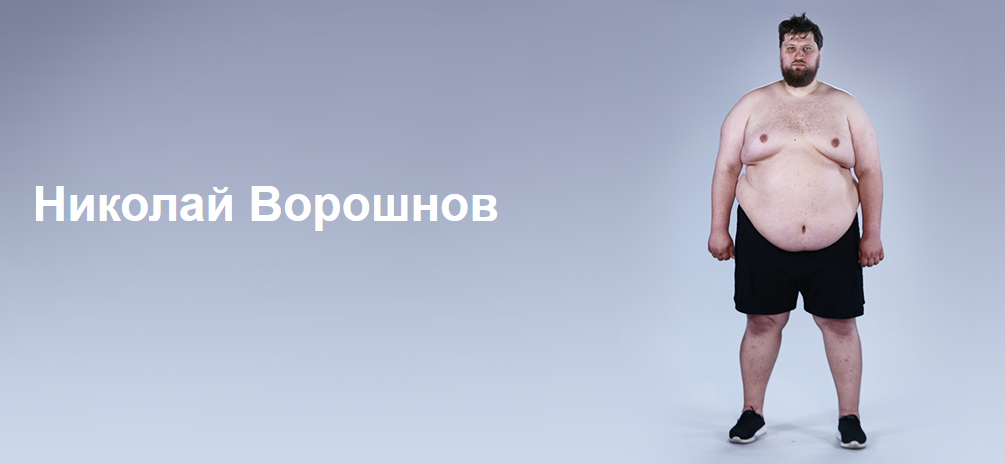 Николай Ворошнов. Ему 33 года. Он победитель первого сезона "Зважені та щасливі". Был добровольцем в АТО. На проект пришел с весом 220 кг, за 12 недель потерял 49 кило, похудев до 171 кг.