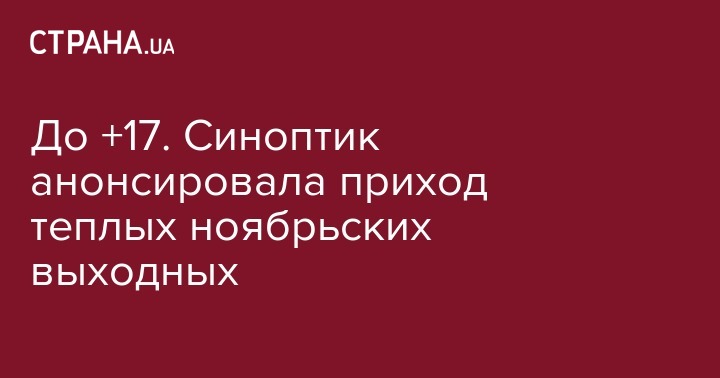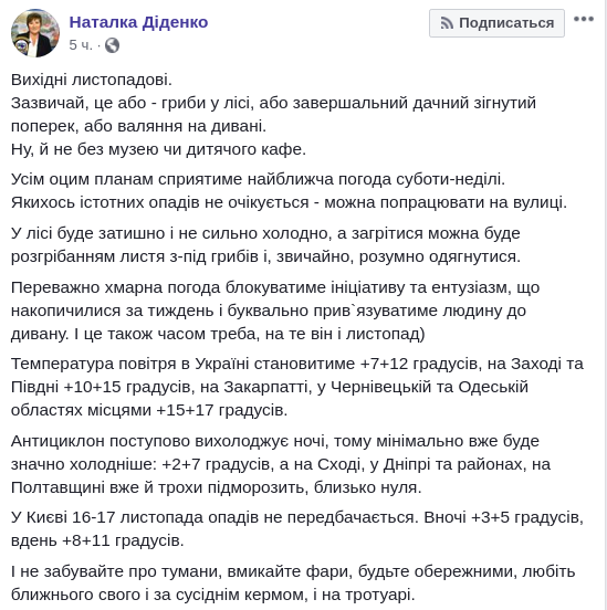 Синоптик Наталья Диденко рассказала, что выходные в Украине будут теплыми и безоблачными. Прогноз погоды на 16-17 ноября она выложила на своей странице в Facebook.