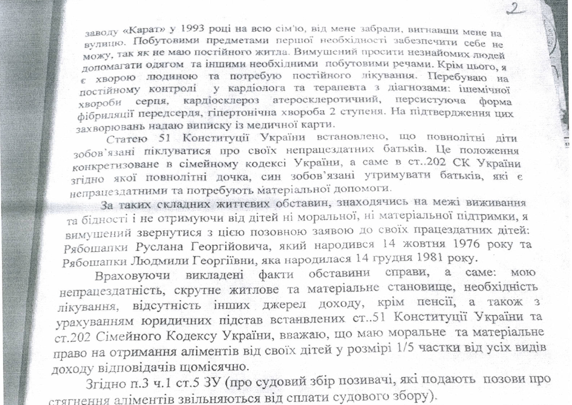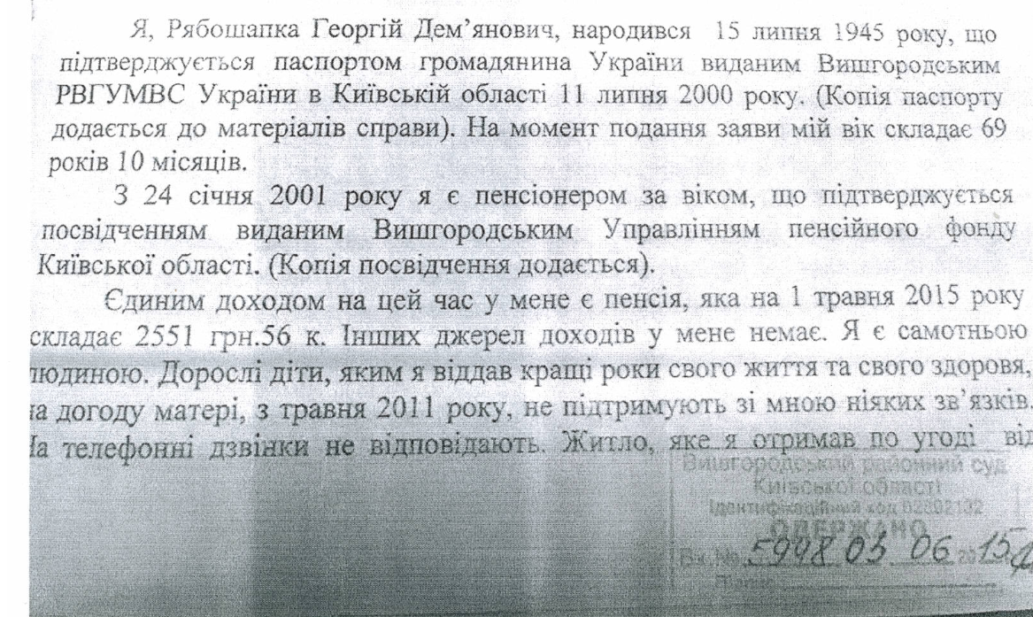 Согласно этим документам, свой первый иск к сыну - нынешнему генпрокурору и дочери - Георгий Рябошапка подал еще 4 июня 2015 года. В исковом заявлении он писал, что его единственным доходом является пенсия - 2 551 грн. 56 копеек. Что лучшие годы своей жизни он посвятил детям и их матери, но которые с 2011 года отношения с ним не поддерживают, на телефонные звонки не отвечают и выставили его на улицу из квартиры в Вышгороде на улице Набережной, которую он получил на семью в 1993 году, работая на заводе "Карат".