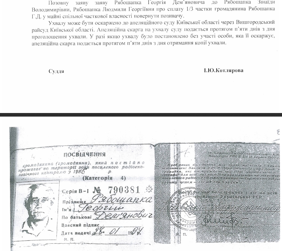 Также Рябошапка-старший в другом иске в тот же Вышгородский суд требовал от жены - Зинаиды и дочери Людмилы выплатить ему 1/3 стоимости части его квартиры в Вышгороде на улице Набережной.