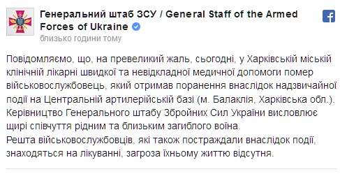 "Сегодня, в Харьковской городской клинической больнице скорой и неотложной медицинской помощи скончался военнослужащий, получивший ранения в результате чрезвычайного происшествия на Центральной артиллерийской базе г. Балаклея, Харьковская обл", - говорится в сообщении.