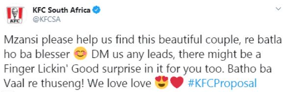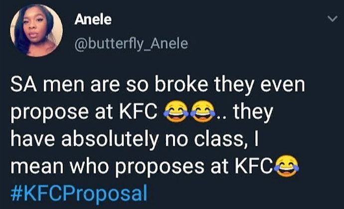 Журналистка под ником @butterfly_Anele на своей официальной странице в Twitter написала: "Мужчины из Южной Африки настолько разорены, что даже делают предложение в KFC. Я даже не знаю, кто может делать предложение в KFC".