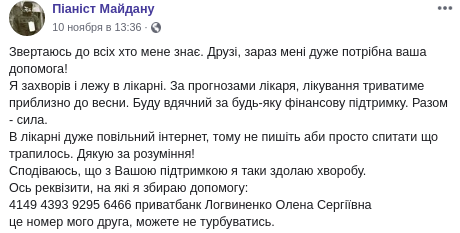 Он сообщил, что остальные подробности можно узнать у адвоката Елены Логвиненко - ответственной за материальную помощь Богдану, а также оставил в посте реквизиты карты на помощь.