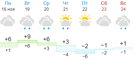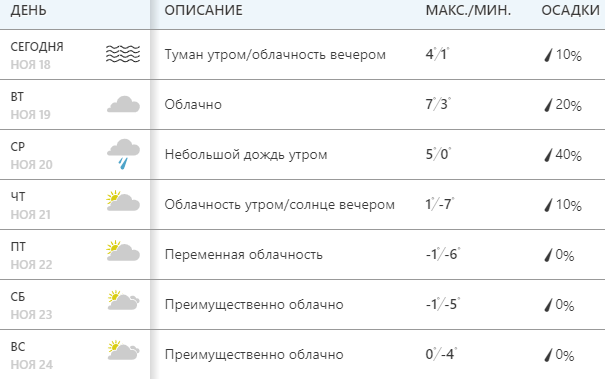 Ресурс Weather.com обещает, что самым холодным днем на этой неделе будет пятница, 22 ноября, когда температура днем будет -1, а ночью -6. В понедельник утром туман, минимальная температура около +1 ночью и днем +4.
