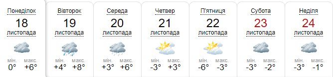 Сайт Gismeteо сообщает, что c понедельника по среду дневная температура в Киеве будет держаться около +6...+9. Ночью +1...+3. Во вторник, среду и четверг - дождь. В пятницу ночью обещают до -6. В воскресенье, 24 ноября, в Киеве мокрый снег. Температура на выходных днем будет -2...+1.
