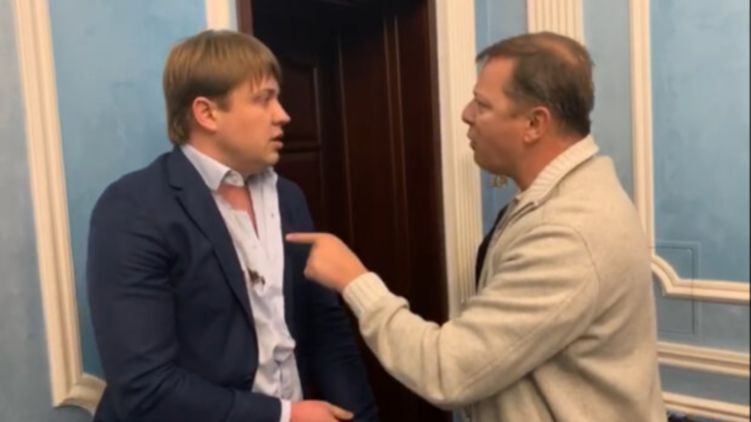 6 ноября в VIP-терминале аэропорта "Борисполь" Олег Ляшко напал на Андрея Геруса. Видео стычки опубликовал олигарх Павел Фукс. На нем Ляшко кричит Герусу: "Ты предатель, ты запустил сюда россиян. Ты, поддонок, за деньги людей ездишь по ЗОДу (Зал официальных делегаций - Ред.)" и рвет на нем рубашку.