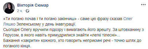 "Ты плохо начал и ты плохо кончишь" - именно эту фразу сказал Олег Ляшко Зеленскому в день инаугурации. Сегодня Олегу вручили подозрение и требуют его ареста. По потасовке с Герусом, у которого даже умудрились найти "легкие телесные"... Желание "закрыть" каждого, кто говорит неприятные вещи - точно путь к плохому концу" - написала она.