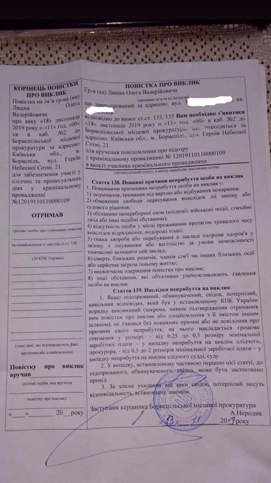 18 ноября прокуратура вручила Ляшко подозрение и сообщила, что будет настаивать на взятии его под стражу. Ходатайство направили в Бориспольский суд.