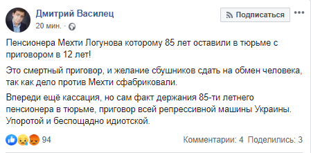"Пенсионера Мехти Логунова которому 85 лет оставили в тюрьме с приговором в 12 лет! Это смертный приговор, и желание сбушников сдать на обмен человека, так как дело против Мехти сфабриковали. Впереди ещё кассация, но сам факт держания 85-ти летнего пенсионера в тюрьме, приговор всей репрессивной машины Украины. Упоротой и беспощадно идиотской", - написал Василец в Facebook.
