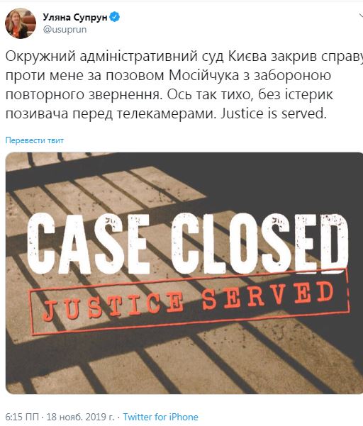 "Окружной административный суд Киева закрыл дело против меня по иску Мосийчука с запретом повторного обращения. Вот так тихо, без истерик истца перед телекамерами. Justice is served", - сообщала она.