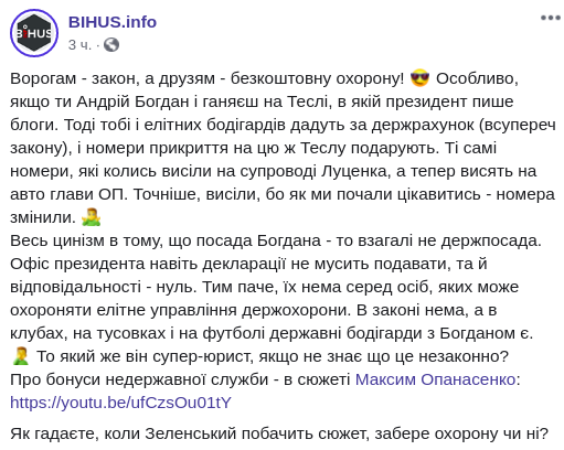"Должность Богдана - это вообще не госдолжность. Офис президента даже декларации не должен подавать, и ответственности - ноль. Тем более, их нет среди лиц, которых может охранять элитное управления госохраны. В законе нет, а в клубах, на тусовках и на футболе государственные бодигарды с Богданом есть", - сказано в сообщении BIHUS info на Facebook.