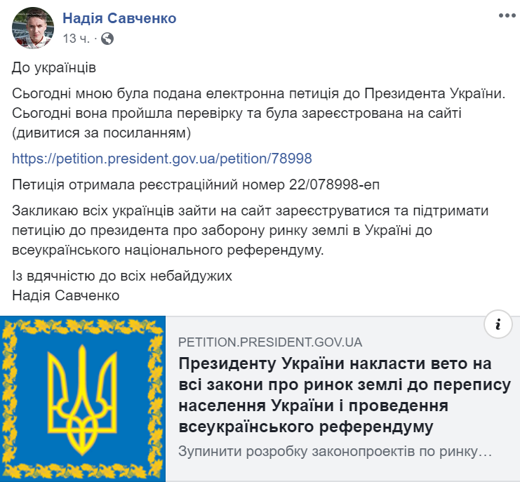 "Сегодня мной была подана электронная петиция к Президенту Украины. Сегодня она прошла проверку и была зарегистрирована на сайте. Петиция получила регистрационный номер 22/078998-еп. Призываю всех украинцев зайти на сайт, зарегистрироваться и поддержать петицию к президенту о запрете рынка земли в Украине до всеукраинского национального референдума", - написала Надежда Савченко в соцсети во вторник, 19 ноября.