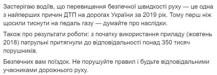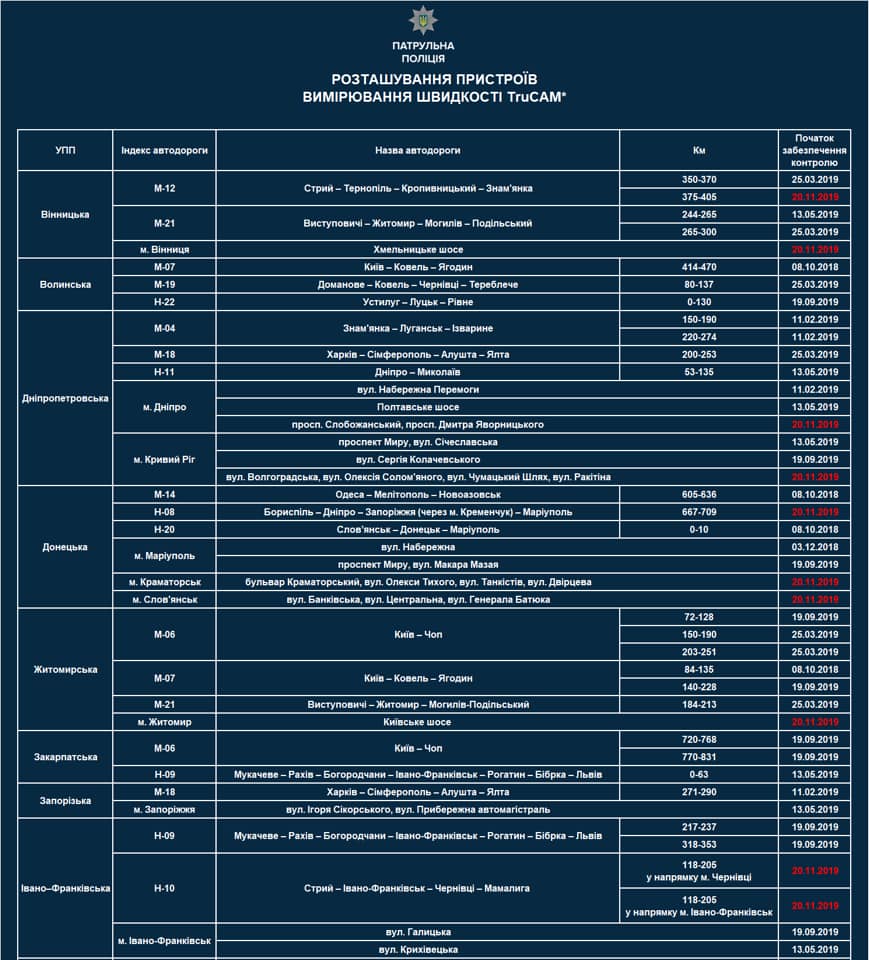 "Расширяем количество участков, где патрульные измерять скорость прибором TruCAM, а также увеличиваем количество таких приборов ... 20 ноября добавляем еще 57 новых участков, а также расширяем уже 2 существующие", - говорится в опубликованном сообщении.