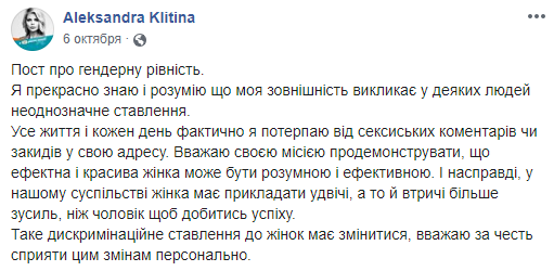 Такое дискриминационное отношение к женщинам должно измениться, считаю честью способствовать этим изменениям персонально", - написала она пост о гендерном равенстве.