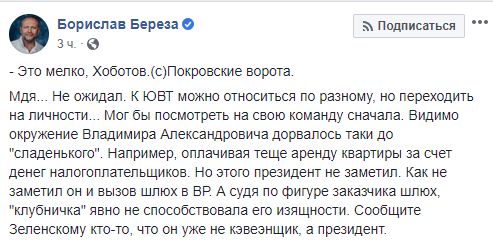 Мдя... Не ожидал. К ЮВТ можно относиться по разному, но переходить на личности... Мог бы посмотреть на свою команду сначала. Видимо окружение Владимира Александровича дорвалось таки до "сладенького". Например, оплачивая теще аренду квартиры за счет денег налогоплательщиков. Но этого президент не заметил. Как не заметил он и вызов шлюх в ВР. А судя по фигуре заказчика шлюх, "клубничка" явно не способствовала его изящности. Сообщите Зеленскому кто-то, что он уже не кэвеэнщик, а президент".