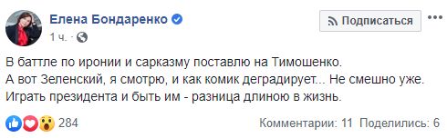Экс-нардеп Елена Бондаренко считает, что Тимошенко пошутила лучше, чем Зеленский: "В баттле по иронии и сарказму поставлю на Тимошенко.