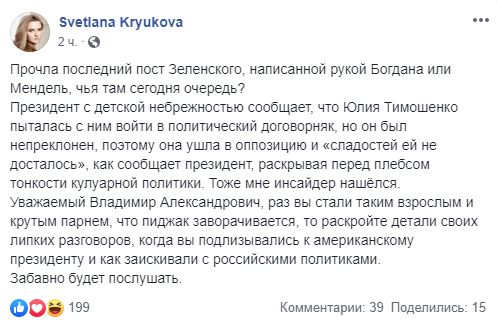 а вот журналист Светлана Крюкова раскритиковала президента: "Прочла последний пост Зеленского, написанной рукой Богдана или Мендель, чья там сегодня очередь?