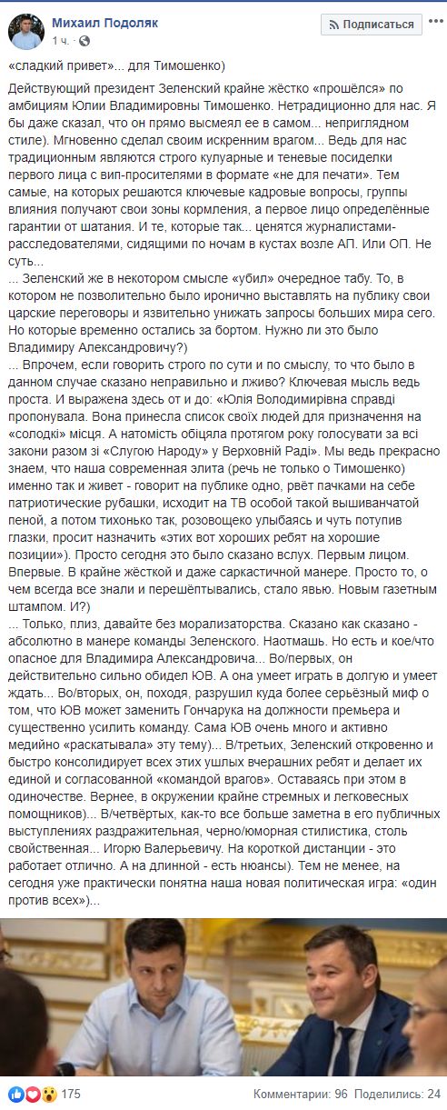 "Действующий президент Зеленский крайне жестко "прошелся" по амбициям Юлии Владимировны Тимошенко. Нетрадиционно для нас. Я бы даже сказал, что он прямо высмеял ее в самом... неприглядном стиле). Мгновенно сделал своим искренним врагом... Ведь для нас традиционным являются строго кулуарные и теневые посиделки первого лица с вип-просителями в формате "не для печати". Тем самые, на которых решаются ключевые кадровые вопросы, группы влияния получают свои зоны кормления, а первое лицо определенные гарантии от шатания. И те, которые так ценятся журналистами-расследователями, сидящими по ночам в кустах возле АП. Или ОП. Не суть...