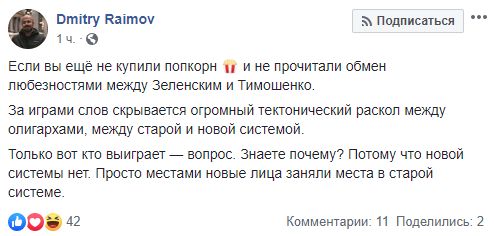 Политолог Дмитрий Раимов пишет о том, что новые лица просто заняли места в старой системе: "Если вы ещё не купили попкорн и не прочитали обмен любезностями между Зеленским и Тимошенко.