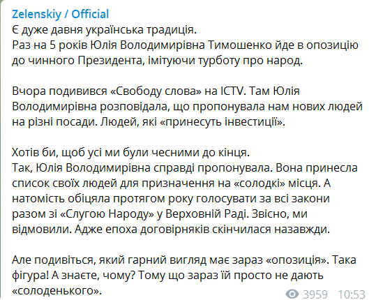 Блогер Евгений Отовчиц напоминает, что "сладкие должности" Зеленский отдал другим людям:  "Владимир Александрович заявил, что Тимошенко "сладких должностей" не досталось.