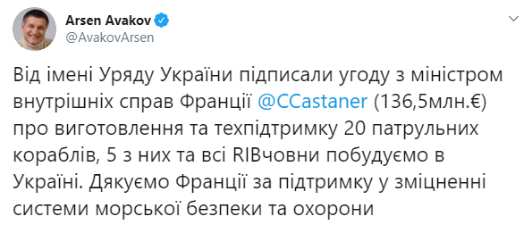 "От имени Правительства Украины подписали соглашение с министром внутренних дел Франции (136,5 млн евро) об изготовлении и техподдержке 20 патрульных кораблей, 5 из них и все RIBлодки построим в Украине", - написал Аваков и поблагодарил Францию за поддержку в укреплении украинской системы морской безопасности и охраны.