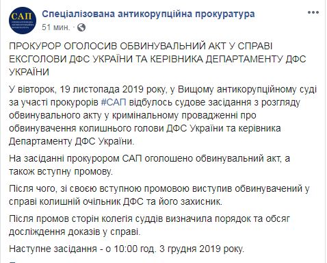"Во вторник, 19 ноября, в Высшем антикоррупционном суде с участием прокуроров САП состоялось судебное заседание по рассмотрению обвинительного акта в уголовном производстве по обвинению бывшего главы ГФС Украины и руководителя департамента ГФС Украины", - сказано в сообщении. Так, на заседании прокурор САП огласил обвинительный акт, а также вступительную речь.