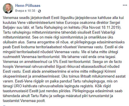 "Непризнание Тартуского мирного договора, по сути, означает непризнание Эстонской Республики. Это свидетельство о рождении нашей страны и одна из важнейших основ нашей государственности", - написал Хенн Пыллуаас.