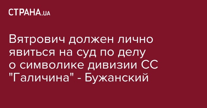 Экс-директор Украинского института национальной памяти Владимир Вятрович должен лично явиться на заседание по суда по иску об оправдании Институтом и лично Вятровичем символики 14-й дивизии СС Галичина. Об этом в своем Telegram написал депутат от фракции "Слуги народа" Макс Бужанский.