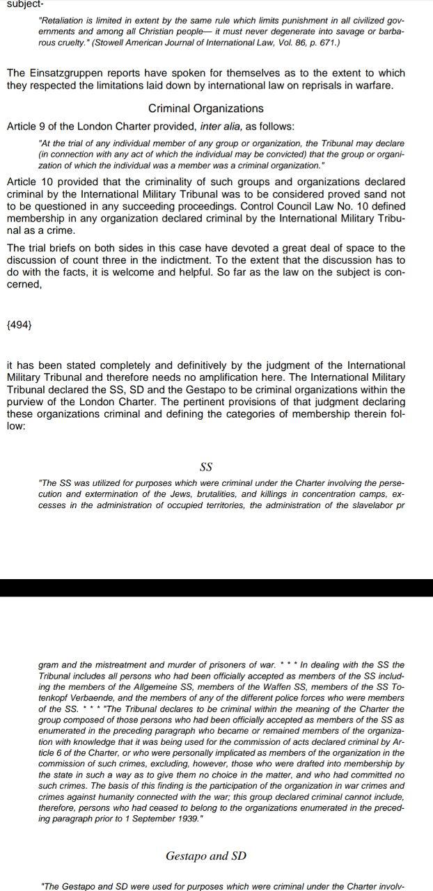 Он отмечает, что после Второй мировой войны международными судами три организации были признаны преступными: СС, СД и Гестапо. "Преступлением являлось само членство в этих организациях, за исключением случаев, когда конкретного персонажа забрали туда насильно", - пишет Бужанский.