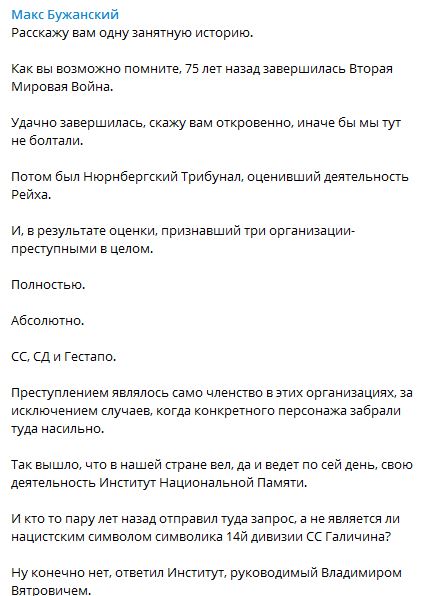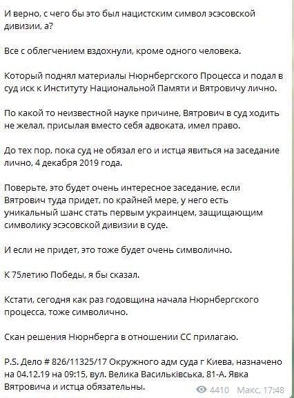 "По какой то неизвестной науке причине, Вятрович в суд ходить не желал, присылая вместо себя адвоката, имел право. До тех пор, пока суд не обязал его и истца явиться на заседание лично, 4 декабря 2019 года. Поверьте, это будет очень интересное заседание, если Вятрович туда придет, по крайней мере, у него есть уникальный шанс стать первым украинцем, защищающим символику эсэсовской дивизии в суде. И если не придет, это тоже будет очень символично. К 75-летию Победы, я бы сказал", - пишет Бужанский.