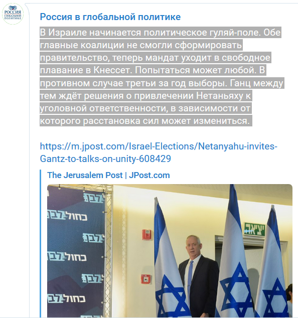 "В Израиле начинается политическое гуляй-поле. Обе главные коалиции не смогли сформировать правительство, теперь мандат уходит в свободное плавание в Кнессет. Попытаться может любой. В противном случае третьи за год выборы. Ганц между тем ждёт решения о привлечении Нетаньяху к уголовной ответственности, в зависимости от которого расстановка сил может измениться", - идет речь в сообщении.