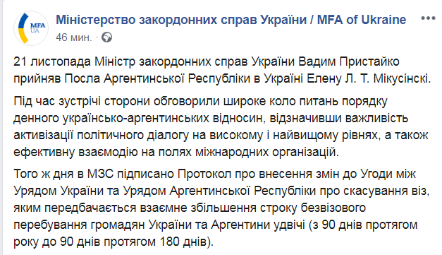 Министр иностранных дел Украины Вадим Пристайко и посол Аргентины в Украине Елена Л. Т. Микусински подписали Протокол о внесении изменений в Соглашение между правительством Украины и правительством Аргентинской Республики об отмене виз. Об этом сообщается в Facebook украинского МИД.