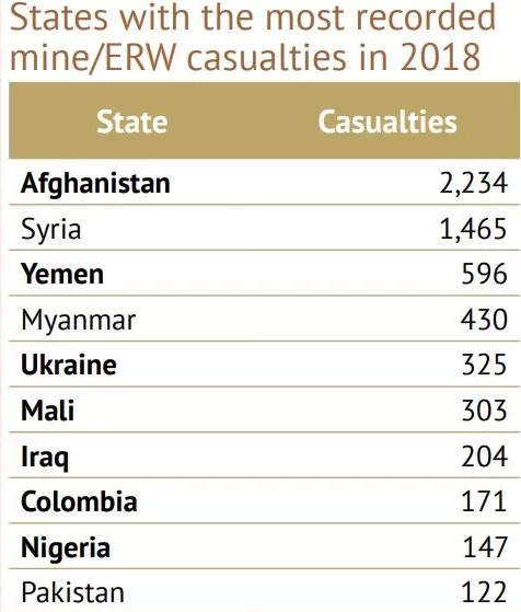 Всего в течение 2018 года в мире от мин и взрывных устройств погибли или получили ранения 6897 человек. Большинство жертв — мирные жители, из которых более половины — дети. Статистика охватывает только официально зарегистрированные и подтвержденные случаи смерти или увечья от мин и аналогичных взрывных устройств.