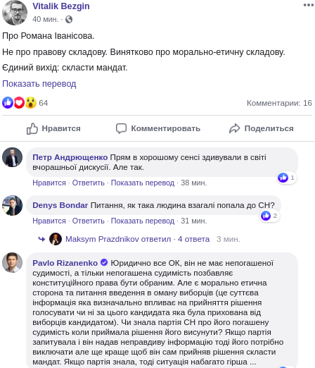 В комментариях его поддержал нардеп-мажоритарщик от "Голоса" Павел Ризаненко.