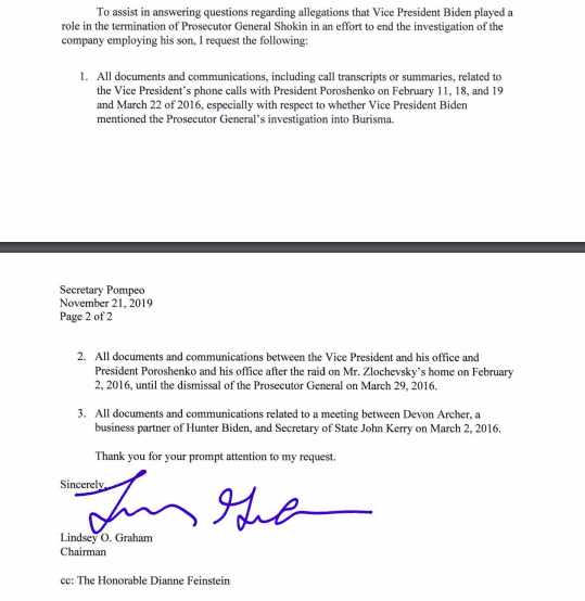 Глава юридического Комитета Сената США Линдси Грэм затребовал у госсекретаря Майка Помпео документы, которые касаются разговоров Петра Порошенко и Джо Байдена, по поводу увольнения Виктора Шокина с должности генерального прокурора Украины. Об этом говорится в письме сенатора, которое он выложил в своем Twitter.