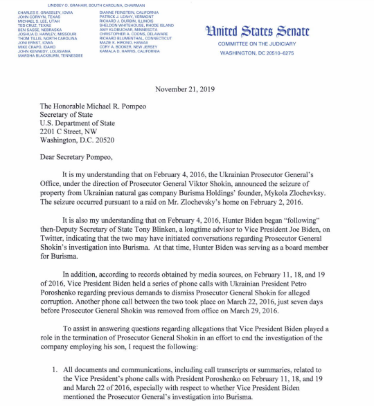 Чтобы выяснить роль Байдена "в увольнении генпрокурора Шокина ради прекращения расследования деятельности компании, где работал его сын", председатель юридического комитета Сената потребовал у госсекретаря документы и стенограммы телефонных разговоров между Байденом и Порошенко в указанные даты.