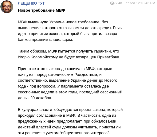С принятием закона МВФ пытается получить гарантии, что Игорю Коломойскому не будет возвращен Приватбанк.