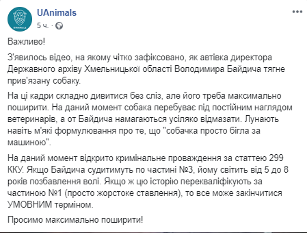 Защитники животных опубликовали видео, на котором автомобиль директора Государственного архива Хмельницкой области Владимира Байдича тащит на цепи привязанную собаку. Соответствующий видеоролик размещен на странице в Facebook организации UAnimals.