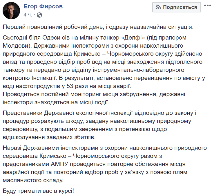Содержание нефтепродуктов в море вблизи Одессы, где сел на мель катер "Делфи", в 53 раза превышает норму. Об этом сообщил и.о. председателя Госэкоинспекции Украины Егор Фирсов на своей странице в Facebook.