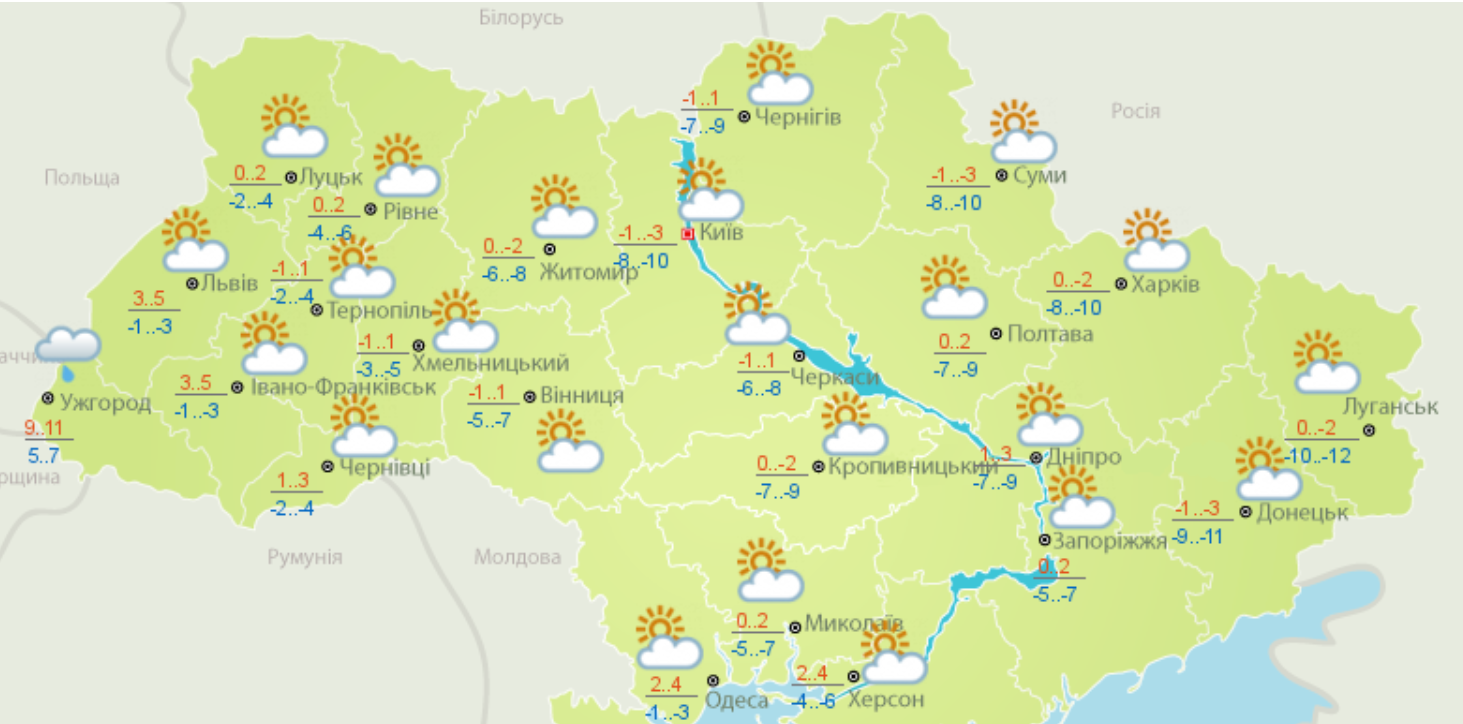 Температура днем может колебаться в пределах 0...+3 градусов. Немного теплее в Прикарпатье - от +2 до +4. Холоднее всего ожидается в северо-восточном регионе (-2... +1), а в Закарпатье (+9... +11).