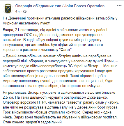 "21 ноября, от одной из воинских частей в районе проведения ООС поступило сообщение о повреждении грузовика. В ходе выезда следственной группы на место инцидента выяснилось, что автомобиль был подбит из противотанкового управляемого ракетного комплекса "Фагот", — указано в сообщении штаба.