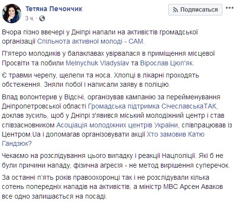 В Днепре пятеро неизвестных в балаклавах избили двух активистов от общественной организации "Сообщество активной молодежи – САМ". Об это сообщила председатель правления ОО "ZMINA. Центр прав человека" Татьяна Печончик в Facebook.