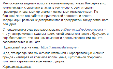 С понедельника буду вам рассказывать о #ХроникахУкроборонпрома – что у нас происходит, куда мы идем, какой видим компанию в будущем, а еще благодарить тех, кто нам помогает, и делать известными тех, кто сопротивляется и мешает.