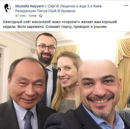 Мустафа – из той же когорты, что и его новый шеф Абромавичус. Он связан с грантовыми организациями, желанный гость в посольстве США и сам недавно пошутил, что входит в "масонскую ложу соросят", разместив фото с Лещенко и Залищук.